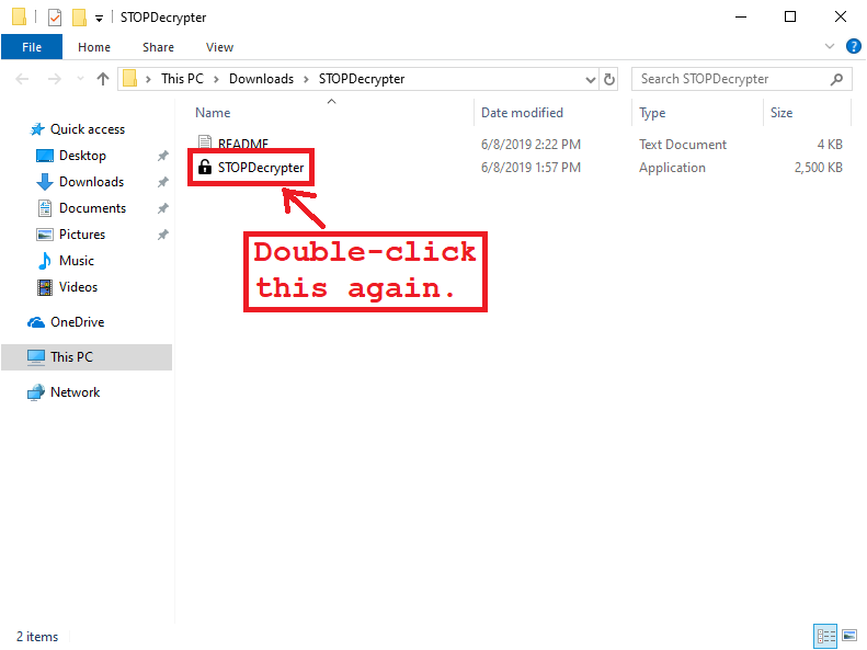 2. When a window opens with two files in it (“README” and “STOPDecrypter”), double-click on the one named STOPDecrypter.