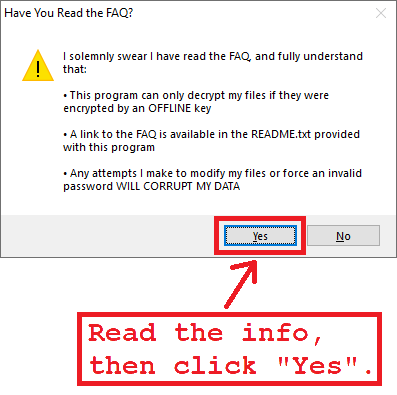 6. STOPDecrypter will display a message asking your if you have read the FAQ. You must click Yes in order to continue. Please read the message before clicking “Yes”.